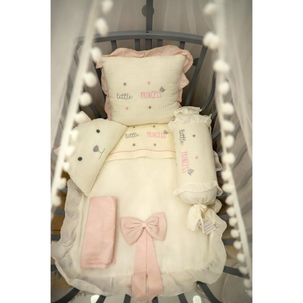طقم مفرش مهد حجم صغير – تصميم الأميرة الصغيرة باللون الزهر